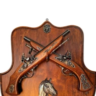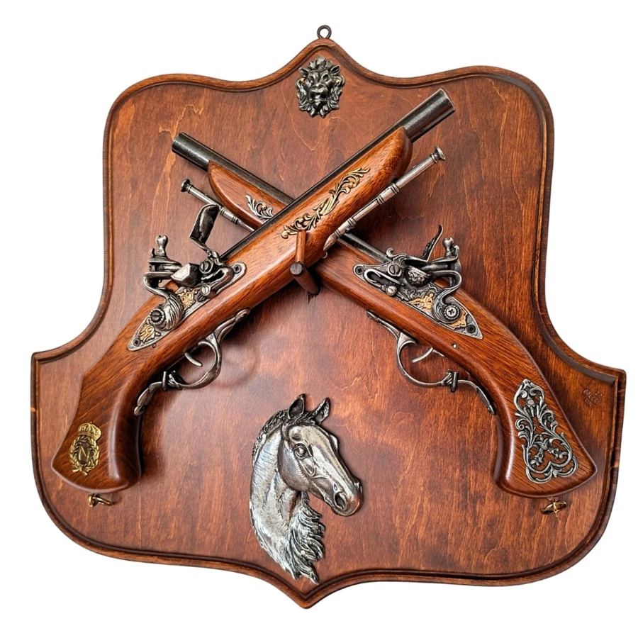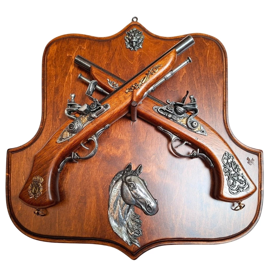 Zestaw dwóch wysokiej jakości replik pistoletów skałkowych na solidnej, drewnianej tarczy. Bogata ornamentyka i realistyczne detale sprawiają, że jest to dekoracja, która nada prestiżu każdemu wnętrzu i przyciągnie wzrok każdego gościa. Zestaw zawiera solidny, drewniany wieszak ścienny, który nie tylko estetycznie eksponuje oba pistolety, ale także umożliwia ich łatwe zdjęcie w dowolnym momencie.