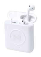 Plastikowy power bank USB z baterią 5000 mAh, wbudowaną ładowarką bezprzewodową (5 W) i prawdziwymi bezprzewodowymi słuchawkami stereo (TWS) z funkcją zestawu głośnomówiącego. Port wejściowy USB-C. W zestawie kabel USB do ładowania.