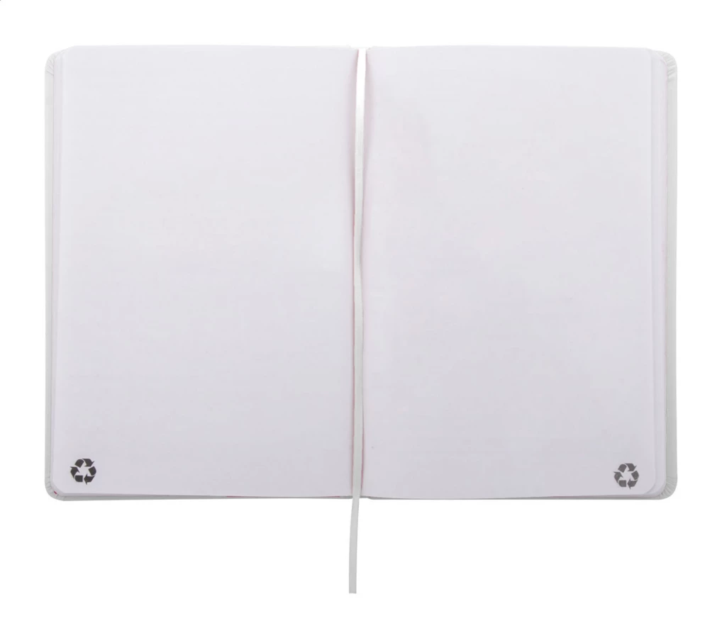Notes pokryty skórą PU z recyklingu, zawierający 100 gładkich kartek z papieru pochodzącego z recyklingu. Z dopasowaną kolorystycznie zakładką i gumką. Rozmiar A5.