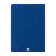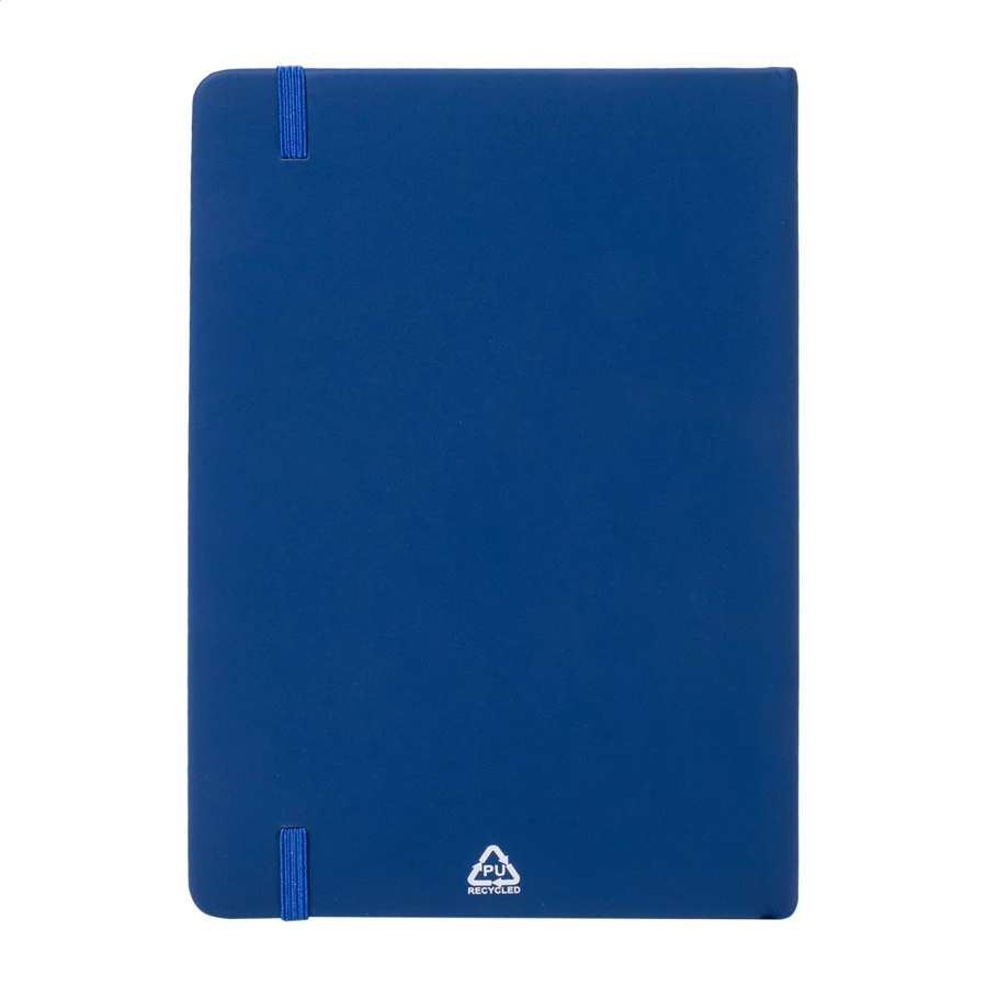 Notes pokryty skórą PU z recyklingu, zawierający 100 gładkich kartek z papieru pochodzącego z recyklingu. Z dopasowaną kolorystycznie zakładką i gumką. Rozmiar A5.