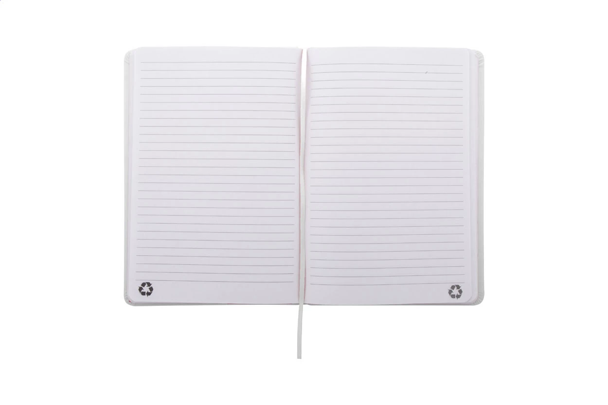 Notes z okładką ze skóry PU z recyklingu ze 100 kartkami w linie z papieru z recyklingu. Z dopasowaną kolorystycznie zakładką i gumką. Rozmiar A5.