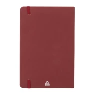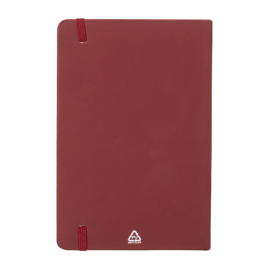 Notes z okładką ze skóry PU z recyklingu ze 100 kartkami w linie z papieru z recyklingu. Z dopasowaną kolorystycznie zakładką i gumką. Rozmiar A5.