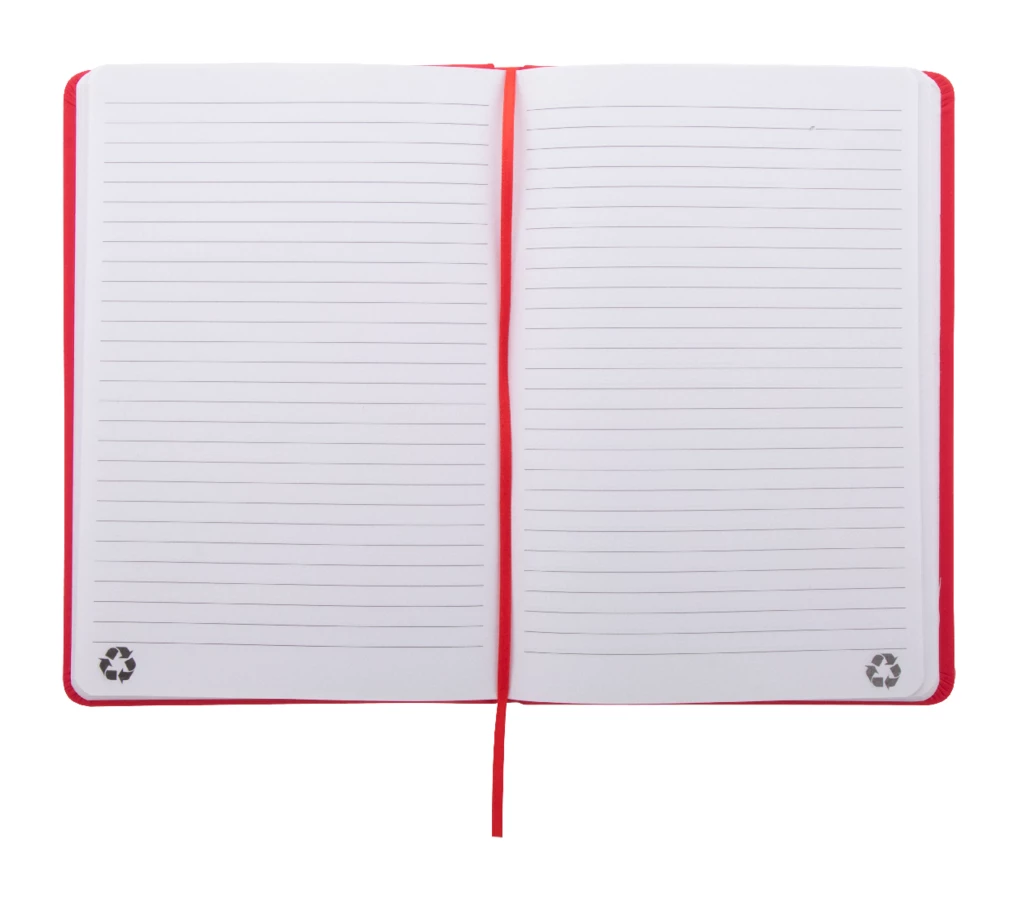 Notes z okładką ze skóry PU z recyklingu ze 100 kartkami w linie z papieru z recyklingu. Z dopasowaną kolorystycznie zakładką i gumką. Rozmiar A5.
