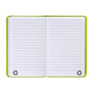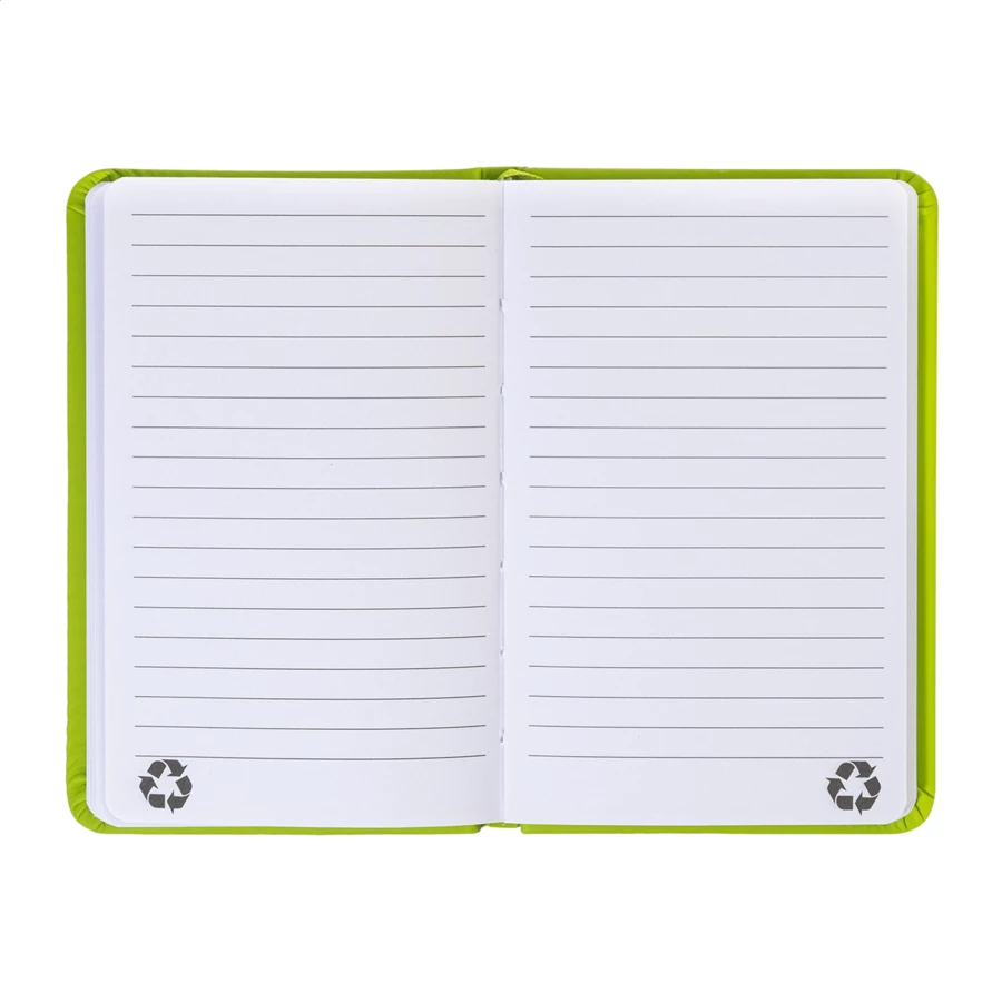 Notes z okładką ze skóry PU z recyklingu ze 100 kartkami w linie z papieru z recyklingu. Z dopasowaną kolorystycznie zakładką i gumką. Rozmiar A6.