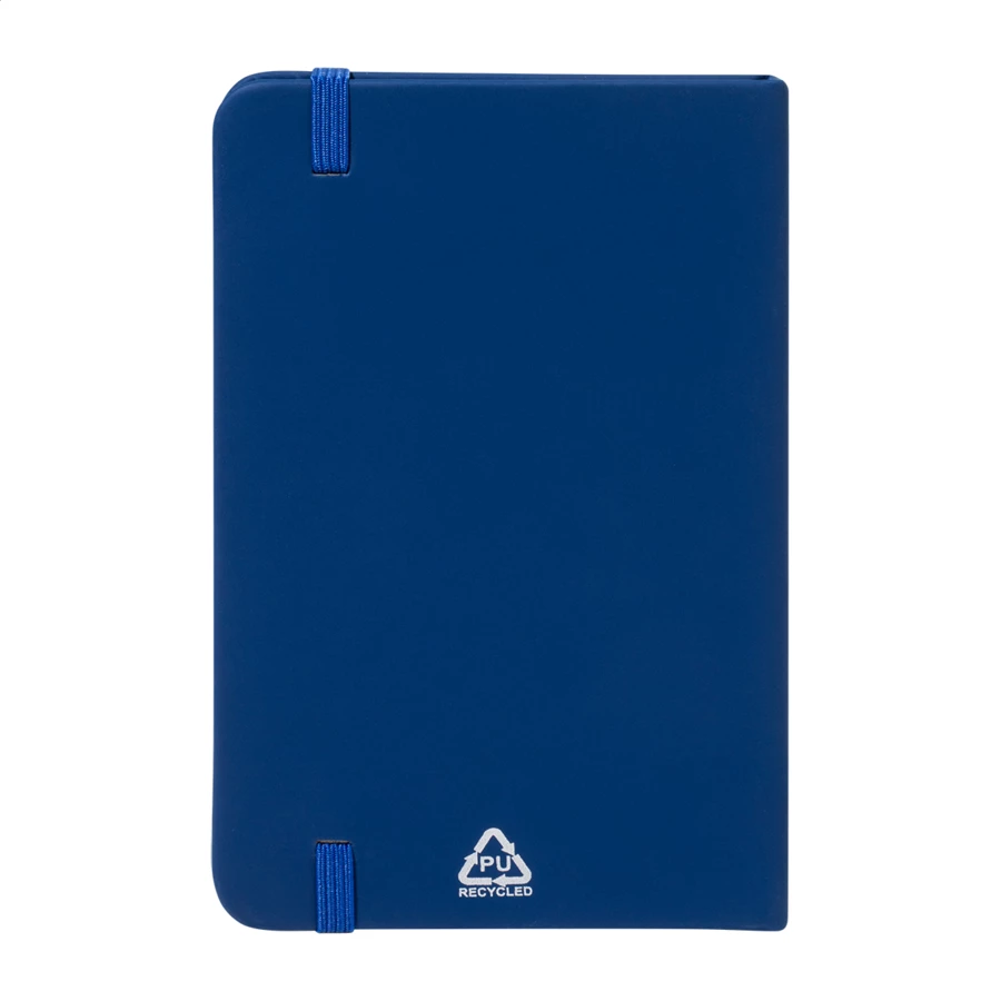 Notes z okładką ze skóry PU z recyklingu ze 100 kartkami w linie z papieru z recyklingu. Z dopasowaną kolorystycznie zakładką i gumką. Rozmiar A6.