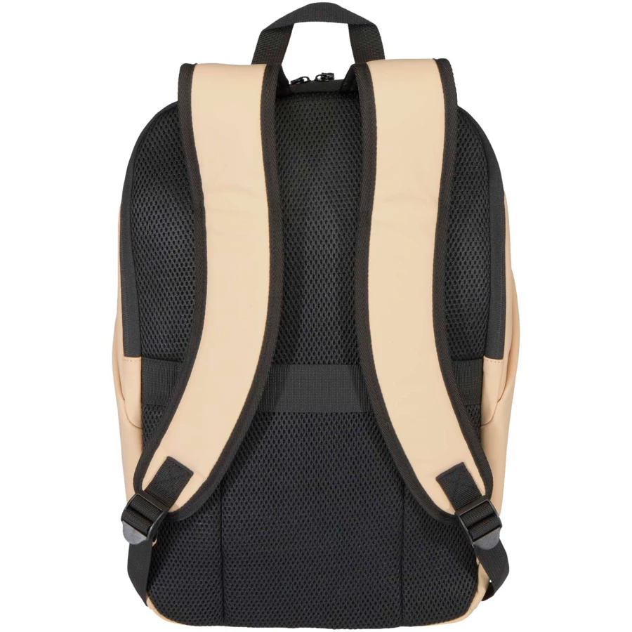 Plecak na laptop 15-calowy wykonany z najwyższej jakości skóry poliuretanowej (PU) z certyfikatem GRS pochodzącej z recyklingu, z podszewką z tworzywa RPET w dopasowanym kolorze, z zabezpieczeniem antykradzieżowym zapewniający ochronę i suchość Twoich rzeczy w podróży. Ma tylną przegrodę na laptopa, dwie opływowe kieszenie boczne i przednią kieszeń zapinaną na suwak z wodoodpornym zamkiem. Oddychający tylny panel gwarantuje całodzienny komfort, dzięki czemu plecak idealnie nadaje się do dojazdów do pracy, podróży i miejskich przygód. Pojemność: 18 litrów.