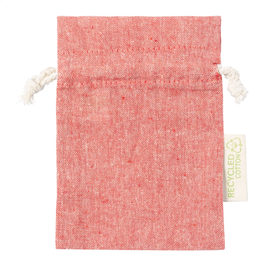 Torba na prezent z bawełny z recyklingu, zamykana na sznurek. Z charakterystyczną metką informującą o bawełnie z recyklingu. 100% bawełna z recyklingu, 120 g/m².