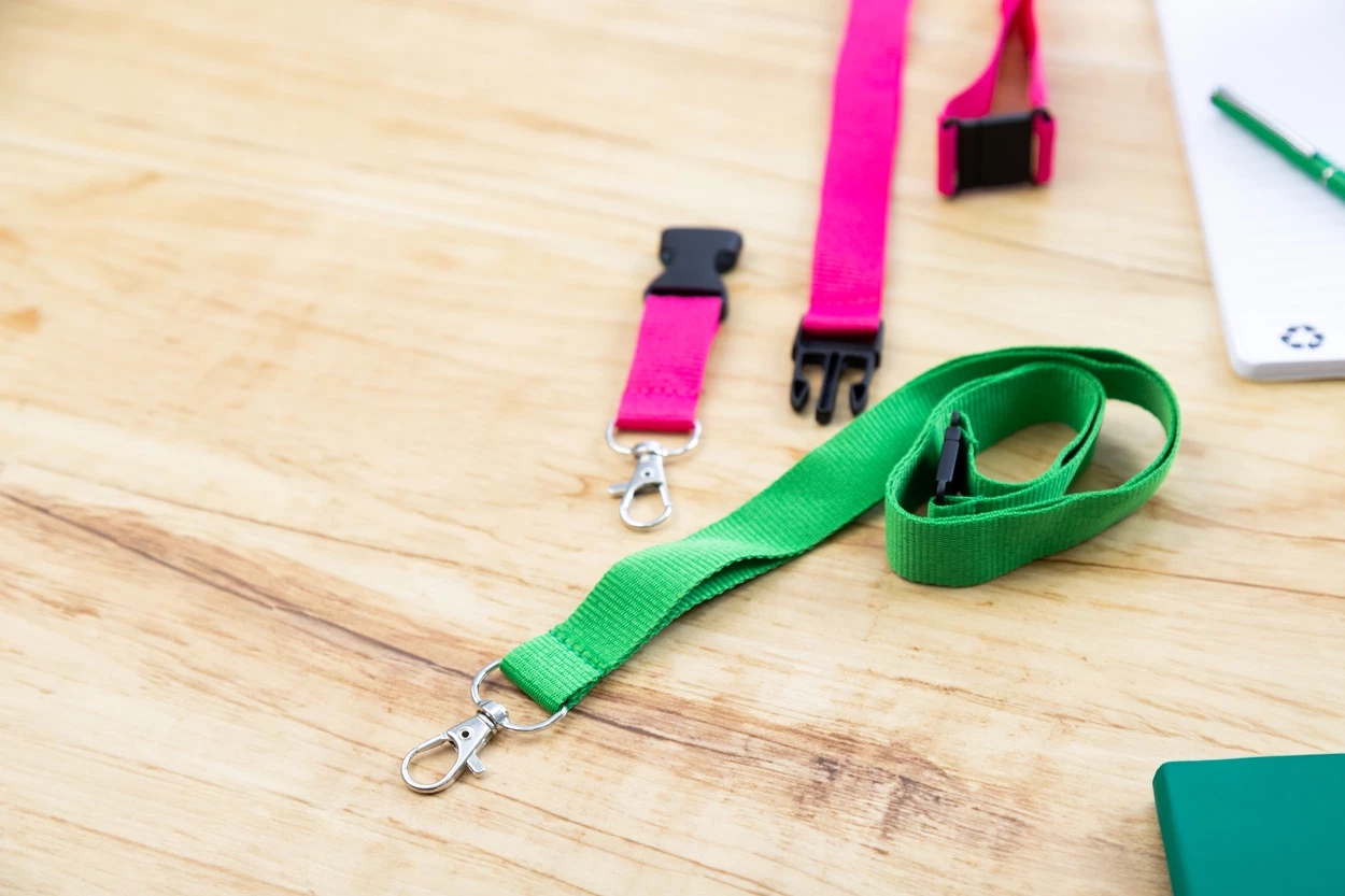 Smycz poliestrowa RPET z metalowym karabińczykiem i klamrą bezpieczeństwa.