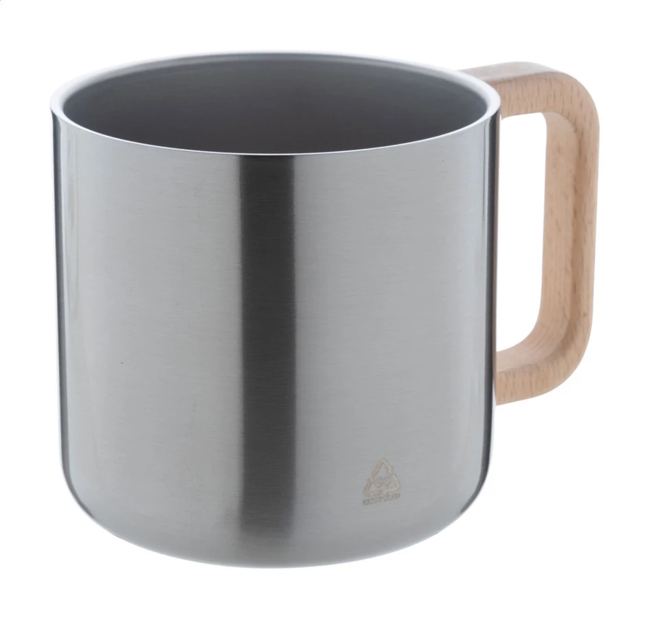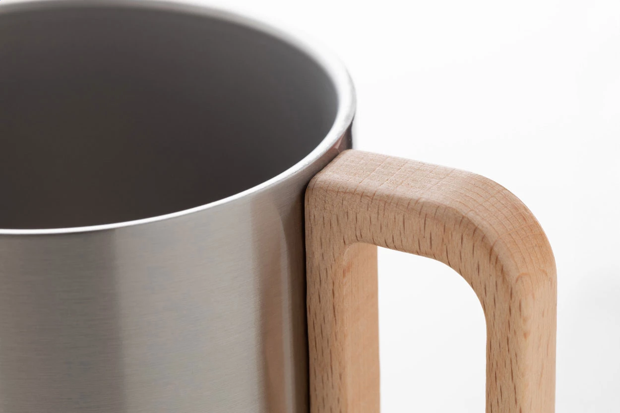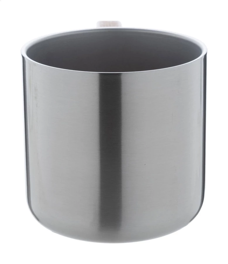 Kubek termiczny ze stali nierdzewnej z podwójnymi ściankami i drewnianym uchwytem. Pojemność 350 ml.