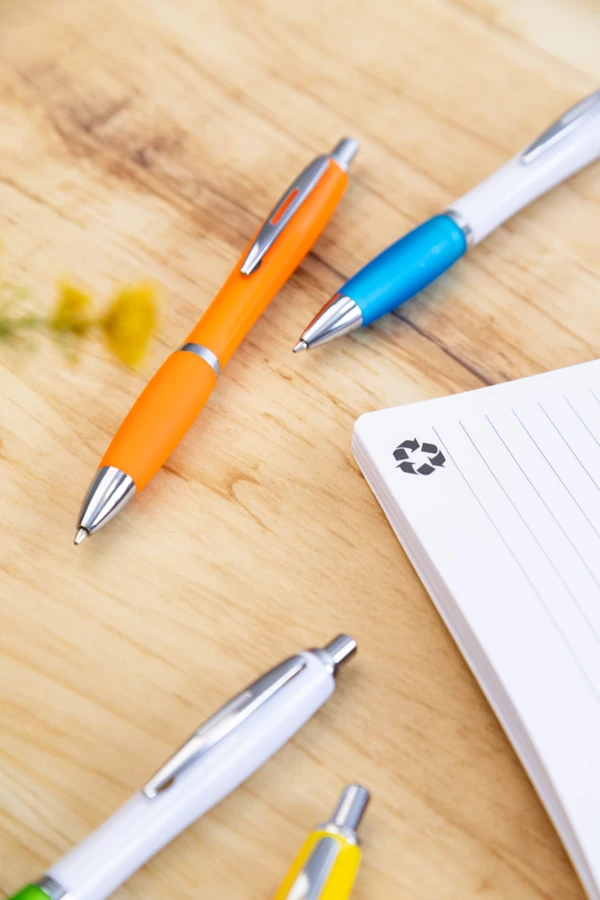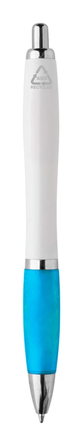 Długopis z recyklingowanego plastiku ABS z białym korpusem, kolorowym uchwytem i chromowanymi elementami. Z niebieskim wkładem.