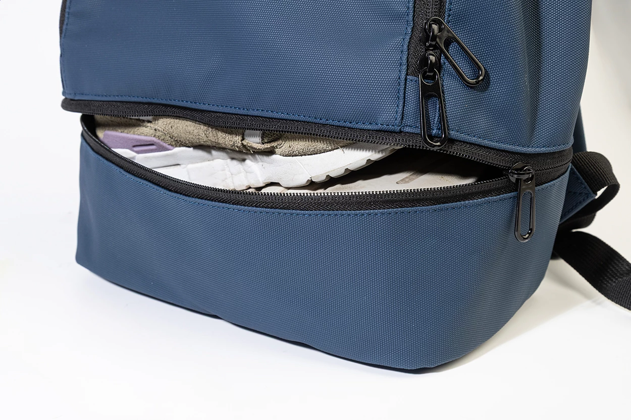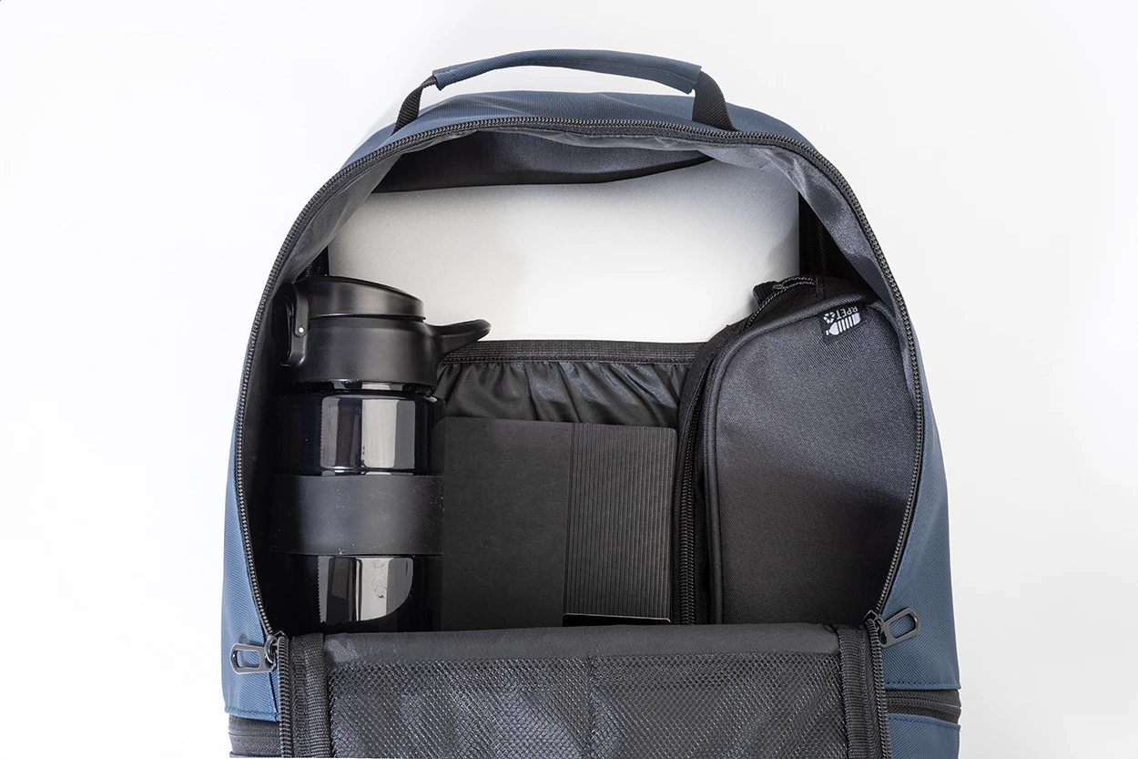 Wodoodporny plecak z materiału RPET z główną komorą zapinaną na zamek, wyściełaną przegrodą na laptopa (13"), dolną komorą zapinaną na zamek i ukrytą kieszenią boczną. Z wyściełanymi plecami i szelkami. Wykonany z poliestru RPET 600D powlekanego poliuretanem, z charakterystyczną metką RPET.