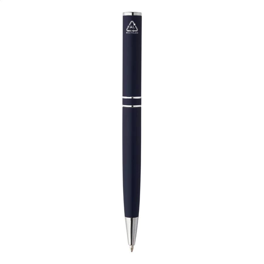 Długopis z przekręcanym wkładem z recyklingowanego aluminium, z chromowanymi elementami i pierścieniami. W czarnym pudełku prezentowym. Z niebieskim wkładem.