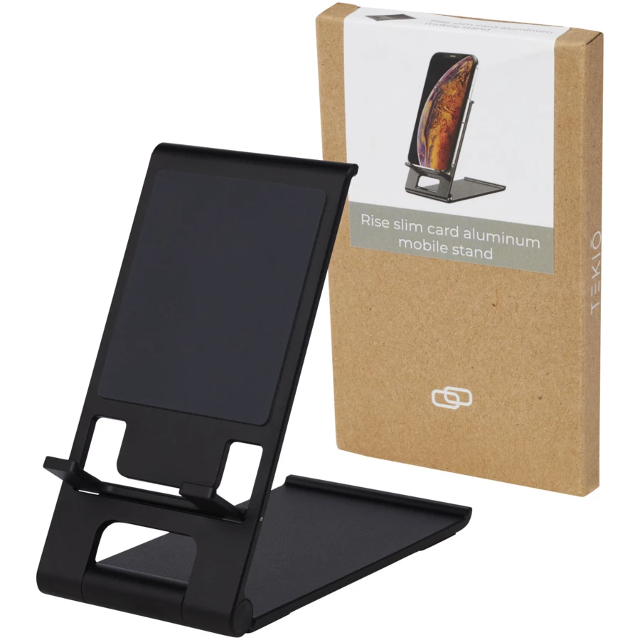 Uchwyt na smartfona ze stylową konstrukcją wykonany z wysokiej jakości aluminium, dzięki czemu urządzenia pozostają bezpieczne na swoim miejscu. Uchwyt można złożyć tak, aby był tak mały jak karta bankowa, dzięki czemu można go łatwo nosić w kieszeni. Można regulować zarówno wysokość, jak i różne kąty widzenia, aby dopasować go do wszystkich swoich potrzeb. Spód pokryty jest antypoślizgowym materiałem, który zapobiega niepożądanemu przesuwaniu się. Dostarczany w wysokiej jakości pudełku Tekiō z papieru kraft z kolorową naklejką.