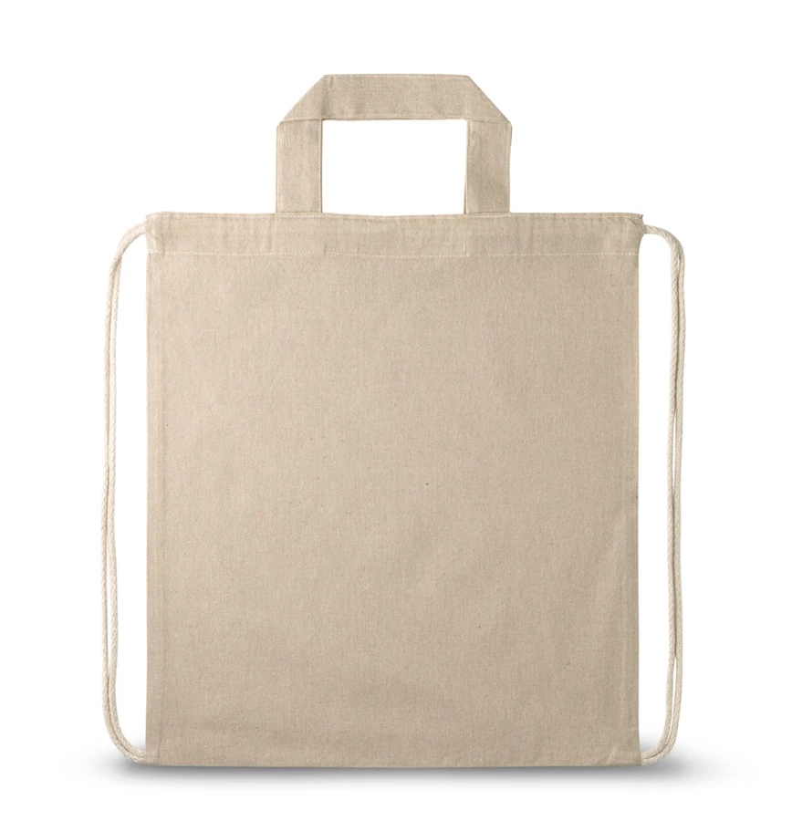 Worek zawierający bawełnę z recyklingu (70%) i poliester (30% rPET) (140 g/m²), z 30 cm uchwytami i bawełnianymi sznurkami do zamykania. Bawełna z recyklingu jest niebarwiona. Surowiec jest używany w swojej oryginalnej formie i kolorze, bez użycia barwiących lub wybielających chemikaliów, co przyczynia się do zmniejszania negatywnego wpływu na środowisko. 370 x 410 mm