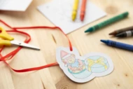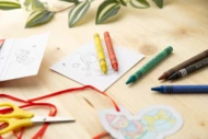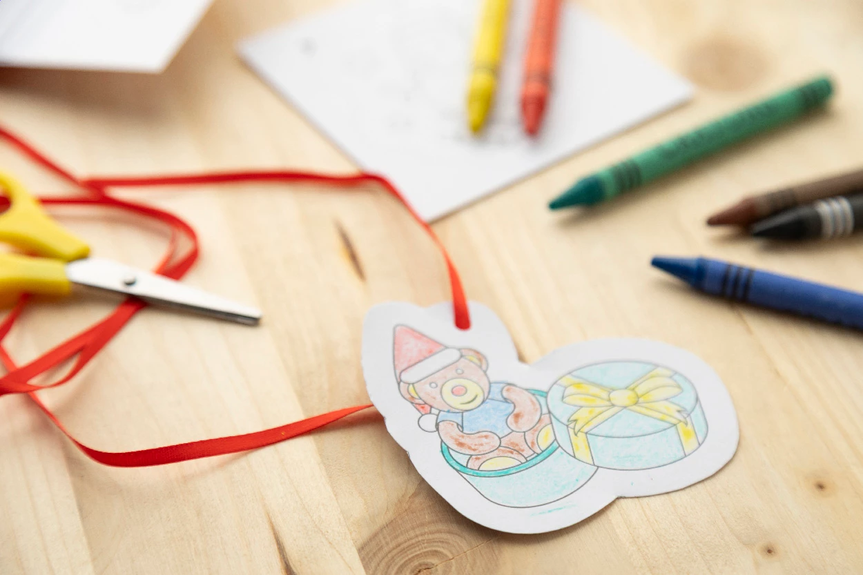 8-elementowy zestaw do kolorowania na Boże Narodzenie z papierowymi ozdobami, 6 kredek i wstążkami do zawieszenia. W czerwonym, papierowym pudełku.