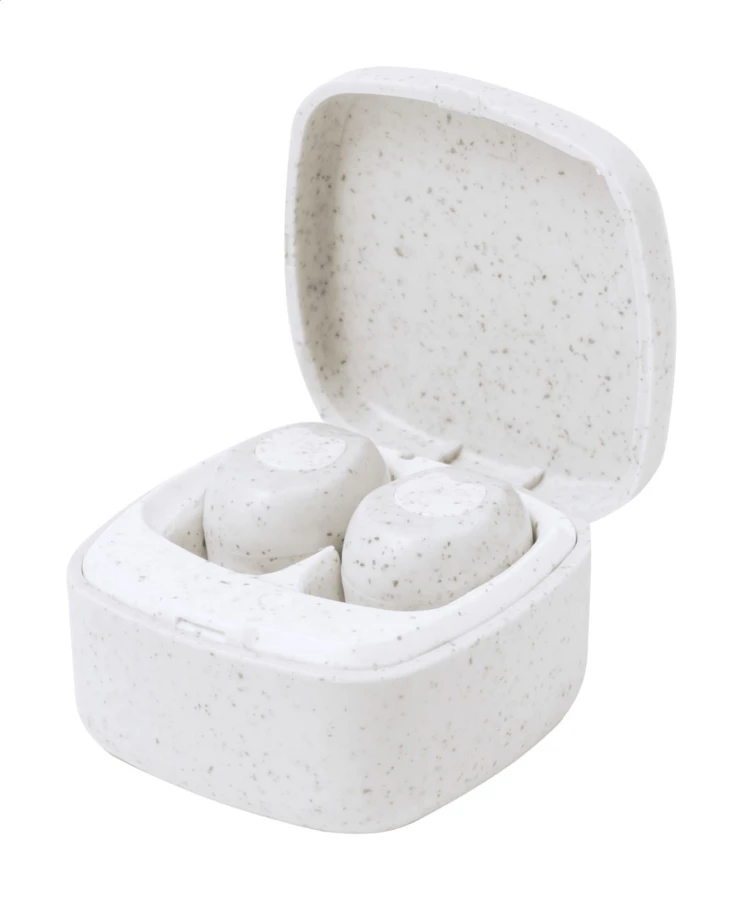 Ekologiczne, wykonane ze słomy pszenicznej, prawdziwie bezprzewodowe słuchawki stereo (TWS) z funkcją zestawu głośnomówiącego w etui z ładowarką. W zestawie kabel USB do ładowarki.