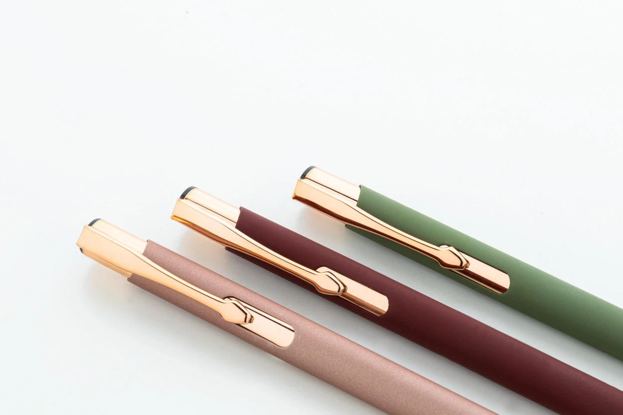 Długopis z aluminium pochodzącego z recyklingu z gumowanym wykończeniem i elementami w kolorze różowego złota. Ze specjalną powłoką pod grawer lustrzany w kolorze różowego złota. Niebieski wkład.