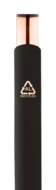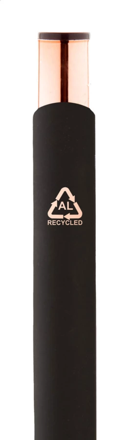 Długopis z aluminium pochodzącego z recyklingu z gumowanym wykończeniem i elementami w kolorze różowego złota. Ze specjalną powłoką pod grawer lustrzany w kolorze różowego złota. Niebieski wkład.