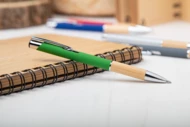 Aluminiowy długopis z bambusowym uchwytem, gumowanym wykończeniem i niebieskim wkładem. Ze specjalną powłoką pod grawer lustrzany.