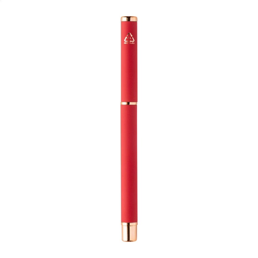 Zestaw długopisów z recyklingowanego aluminium, z długopisem kulkowym i cienkopisem, z gumowanym wykończeniem i detalami w kolorze różowego złota. Z niebieskim wkładem. Ze specjalną powłoką do grawerowania laserowego w kolorze różowego złota. W czarnym papierowym pudełku prezentowym.