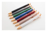 Długopis z recyklingowanego aluminium z matowym wykończeniem, teksturowanym uchwytem i detalami w kolorze różowego złota. Ze specjalną powłoką do lustrzanego grawerowania laserowego w kolorze różowego złota. Z niebieskim wkładem.
