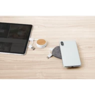 Wielofunkcyjny kabel zwijany 6 w 1 łączy w sobie design, funkcjonalność i wszechstronność. Jego innowacyjny system pozwala na wysunięcie końcówek tylko wtedy, gdy jest to konieczne, co pozwala uniknąć luźnych lub splątanych kabli podczas transportu lub przechowywania. Adaptery na obu końcach zapewniają kompatybilność z wieloma urządzeniami. Ponieważ produkt jest wykonany z naturalnych materiałów, kolor produktu oraz wynik drukowania mogą się różnić w zależności od produktu.Materiał: ABS z recyklingu (100% rABS) i bambusWejście: USB-C, USB-A (9 W)Wyjście: USB-C, 2 w 1 microUSB i Lightning (10 W)Funkcje: ładowanieOpakowanie: papierowe pudełko prezentowe typu kraft.Wymiary: 40 x 130 mm | Rozciągnięty kabel: 40 x 800 mm | Pudełko: 73 x 55 x 25 mm