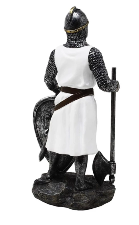 Ozdobna figurka przedstawiająca średniowiecznego templariusza w pełnym rynsztunku – z tarczą, toporem i mieczem. Templariusz odziany w charakterystyczny biały płaszcz z czerwonym krzyżem – symbol zakonnej odwagi i dyscypliny.