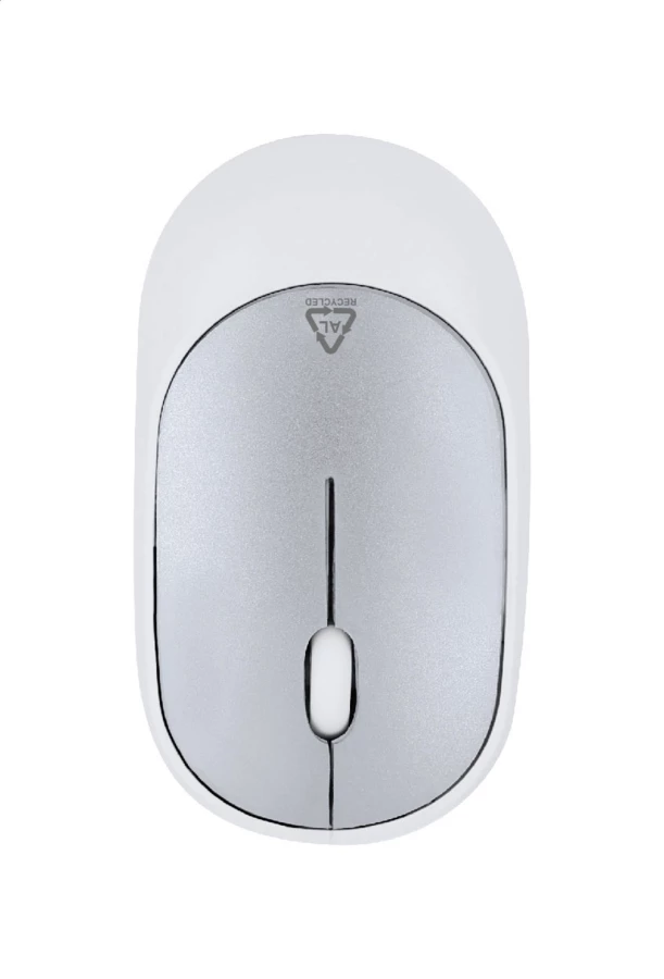 Bezprzewodowa mysz optyczna w obudowie z tworzywa ABS pochodzącego z recyklingu i aluminium pochodzącego z recyklingu. Działa z baterią 1AA, dostarczaną bez baterii.