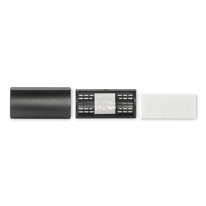 Odświeżacz powietrza z aluminiową pokrywą i klipsem ABS. Zawiera wkładkę filcową RPET na płyn zapachowy (brak w zestawie).
