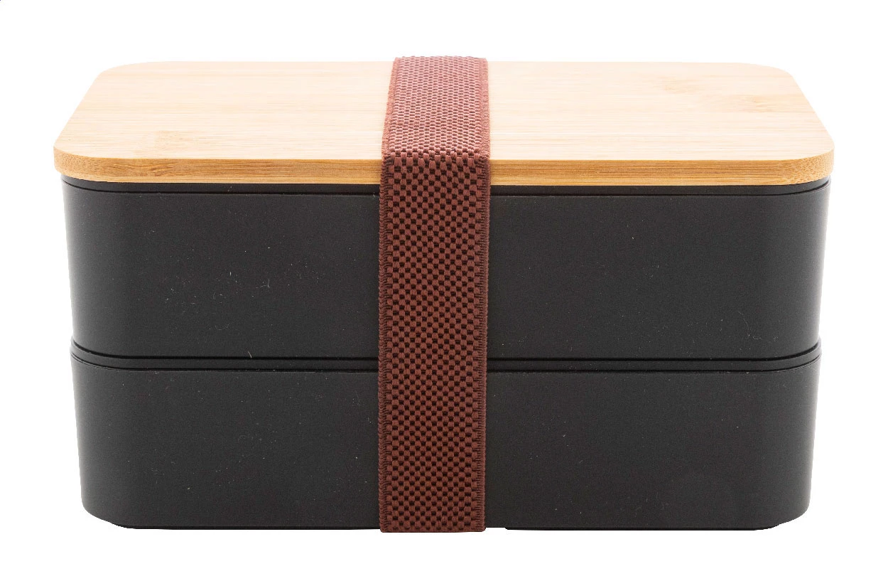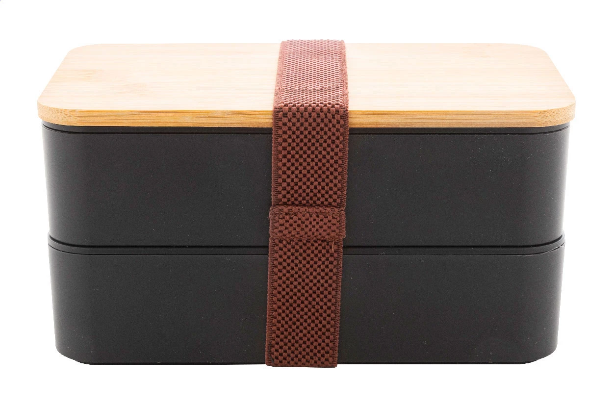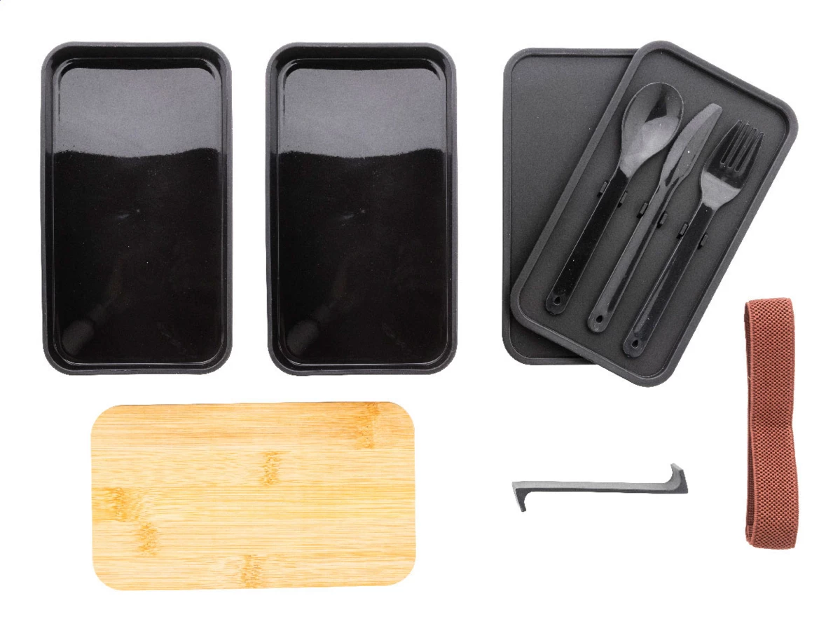 Pudełko śniadaniowe z tworzywa PP z zestawem sztućców (widelec, łyżka i nóż), bambusową pokrywką i elastycznym paskiem. Z 2 przegródkami o pojemności 700 ml każda.