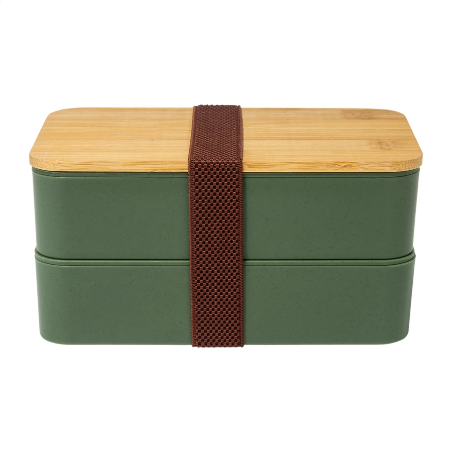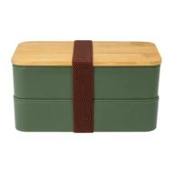 Pudełko śniadaniowe z tworzywa PP z zestawem sztućców (widelec, łyżka i nóż), bambusową pokrywką i elastycznym paskiem. Z 2 przegródkami o pojemności 700 ml każda.