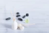 Zestaw zapachowy z olejkiem jaśminowym, ceramiczną wazą, 5 drewnianymi pałeczkami i 2 drewnianymi kulkami. Białe pudełko prezentowe.