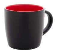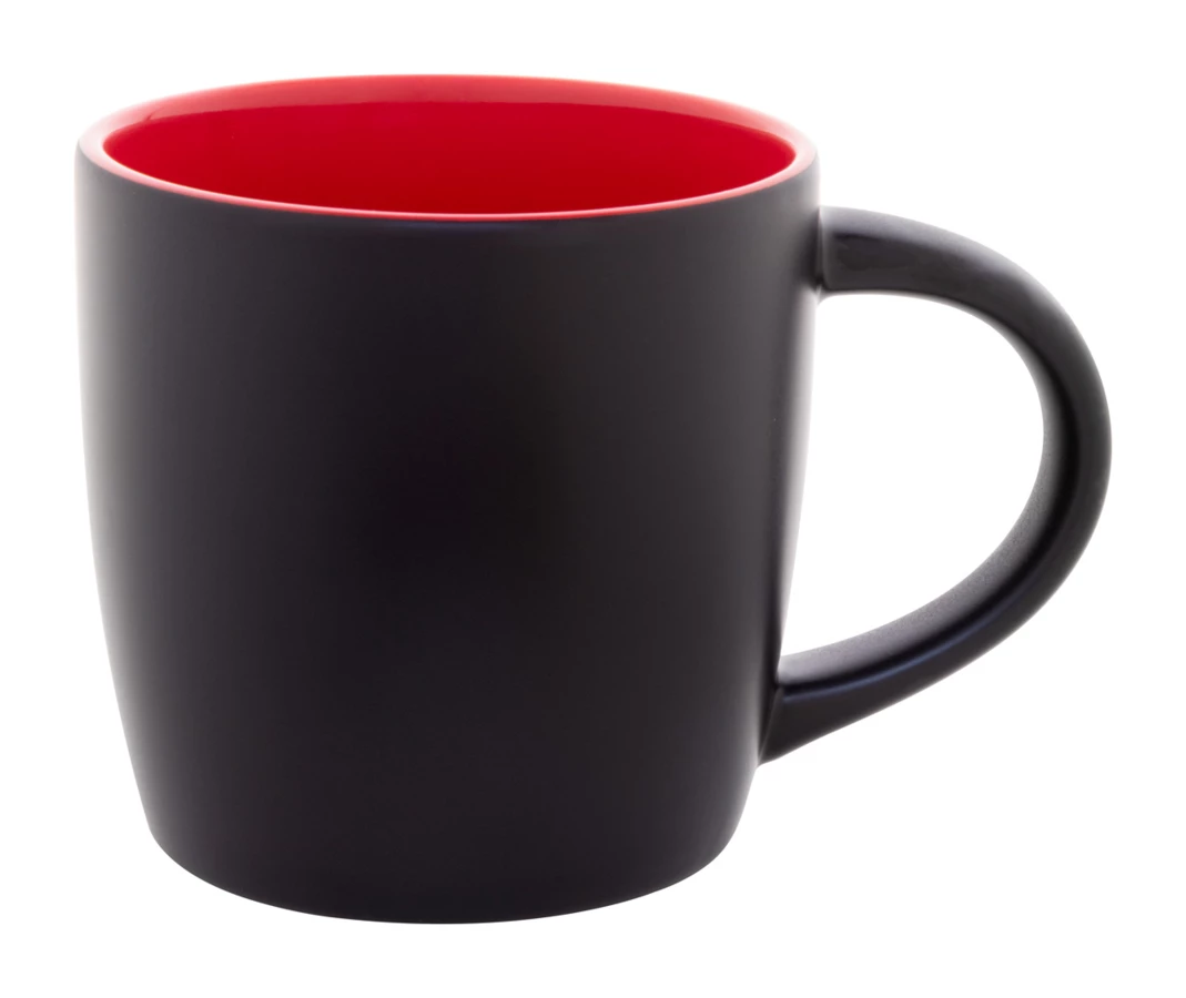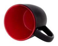Czarny kubek ceramiczny z kolorowym wnętrzem, pojemność 300 ml. Dzięki specjalnej powłoce do grawerowania, wygrawerowane logo jest dopasowane do koloru wnętrza. W pudełku z papieru kraft.