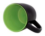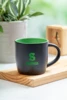 Czarny kubek ceramiczny z kolorowym wnętrzem, pojemność 300 ml. Dzięki specjalnej powłoce do grawerowania, wygrawerowane logo jest dopasowane do koloru wnętrza. W pudełku z papieru kraft.