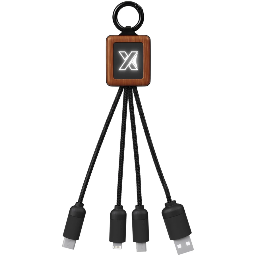 Drewniany kabel FSC 3 w 1 z podświetlanym logo i 3 złączami (typu C/micro USB/iPhone). Przewody wykonane są z materiału RPET, a drewno posiada certyfikat FSC. Kabel może ładować do 3 urządzeń jednocześnie. Patent EUROPE EUIPO.
