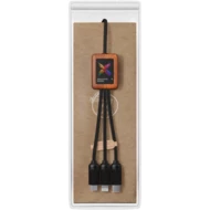 Kabel do ładowania z podświetlanym logo z tworzywa sztucznego PET 5-w-1 z kwadratową bambusową obudową. Podświetlane logo jest widoczne po obu stronach. Posiada 3 złącza (typ C, micro USB, iPhone) i podwójne złącze USB do uniwersalnego zastosowania. Dostarczane w etui z tworzywa sztucznego TPU z kartą z papieru Kraft. Długość kabla: 1 metr. 3-letnia gwarancja.