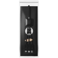 Kabel do ładowania i transferu danych 5 w 1 z przetworzonego tworzywa PET z podświetlanym logo z kwadratową plastikową obudową. Podświetlane logo jest widoczne po obu stronach. Wyposażony w 3 złącza (typu C, Micro USB, iPhone) oraz podwójne złącze USB uniwersalnego zastosowania. Kabel umożliwia transfer danych na każdej z końcówek i dla każdego typu urządzenia (USB-C + Lightning + Micro USB). Dostarczane w etui z tworzywa sztucznego TPU z kartą z papieru Kraft. Długość kabla: 1 metr. 3-letnia gwarancja.