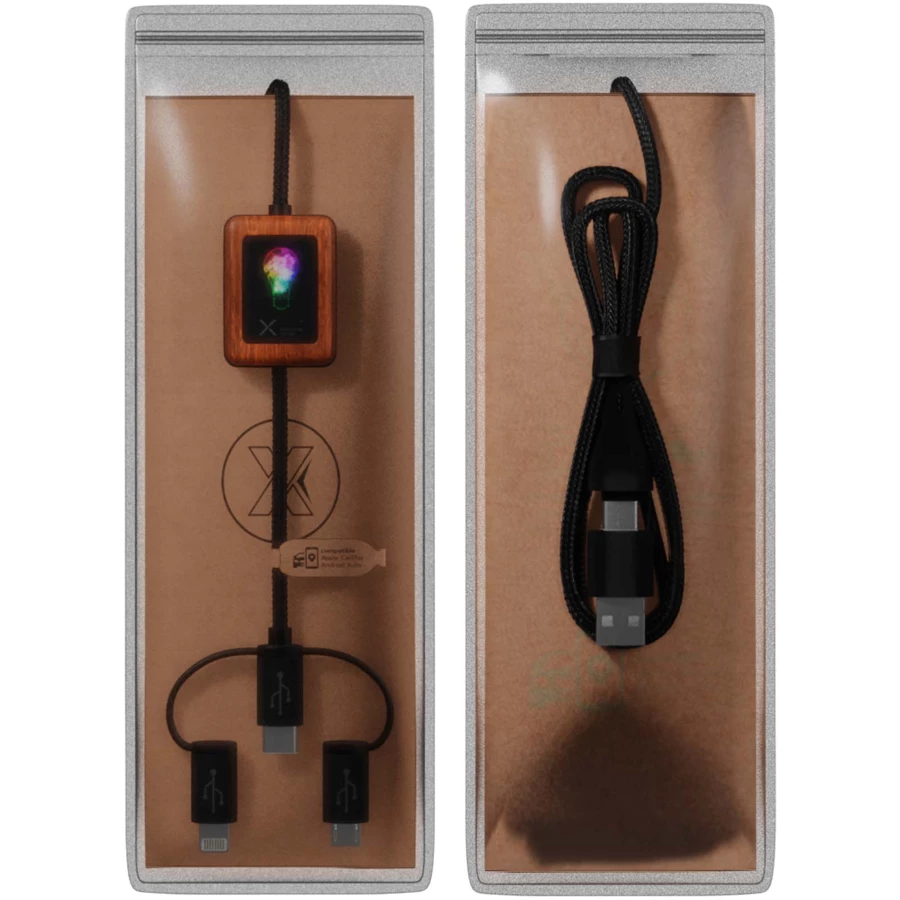 Gumowy kabel ładujący z bambusowym wykończeniem z funkcją przesyłania danych i podwójnym podświetlanym logo. Kabel jest wykonany z przyjaznych dla środowiska materiałów: plastiku ABS z recyklingu i rPET z przetworzonych butelek. Może być używany z Apple CarPlay i Android Auto do aplikacji samochodowych. Dzięki podwójnemu wyjściu USB-A i USB-C kabel jest w 100% kompatybilny z najnowszymi komputerami na rynku (USB-C). Kabel może być spersonalizowany za pomocą dwóch podświetlanych logo (po jednym z każdej strony). Długość kabla: 1 metr. Dostarczany w etui z TPU (17,5 x 5,5 cm) z papierową kartą. 3-letnia gwarancja.