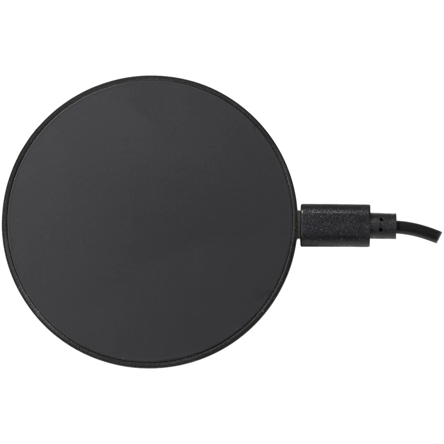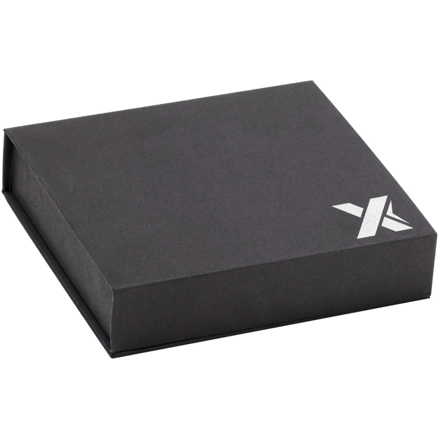 Gumowa, bezprzewodowa stacja ładująca o mocy 10 W z podświetlanym logo i kablem ładującym wykonanym z plastiku z recyclingu. Dostarczana w czarnym pudełku upominkowym z magnetycznym zamknięciem. Patent EUROPE EUIPO.