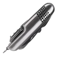 Doskonały 13-funkcyjny scyzoryk. Wykonany ze stali nierdzewnej. Pakowany w poliestrowe etui. Zawiera: 1) piła, 2) pilnik jednorzędowy, 3) nożyczki, 4) skrobak do ryb z końcówką do haczyków, 5) nóż, 6) otwieracz do butelek, 7) wkrętak płaski, 8) oczko do troczenia, 9) korkociąg, 10) ucho do przewlekania, 11) pilnik, 12) szydło, 13) wkrętak krzyżowy, 14) otwieracz do konserw.