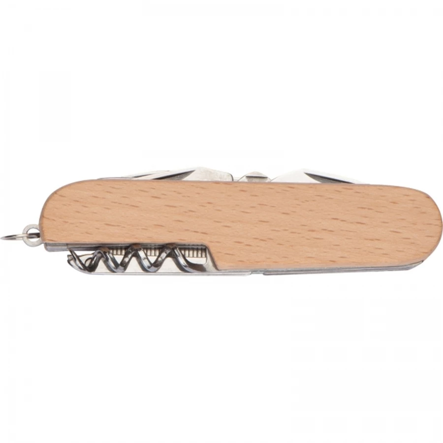 Scyzoryk z 11 funkcjami, wykonany ze stali nierdzewnej, w drewnianej obudowie. Posiada m. in. 2 piły, nożyczki, otwieracz do butelek i puszek, korkociąg, tarnik i śrubokręt.