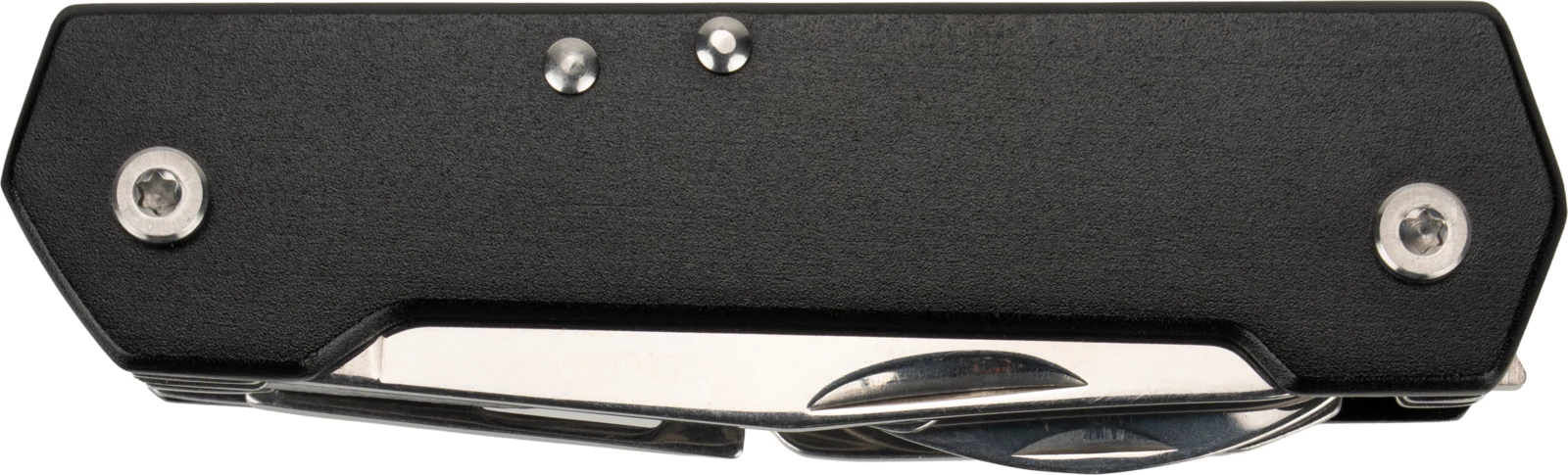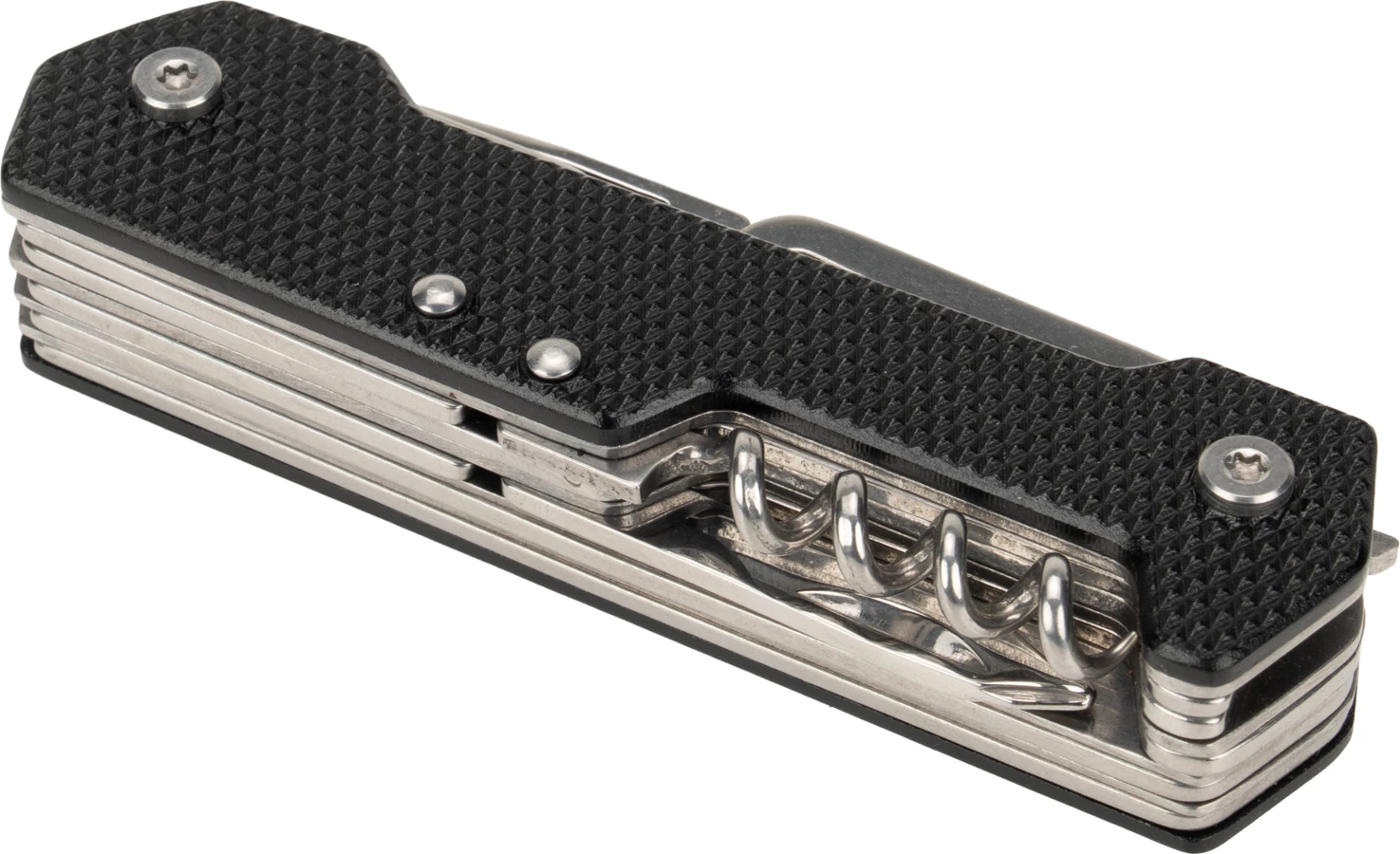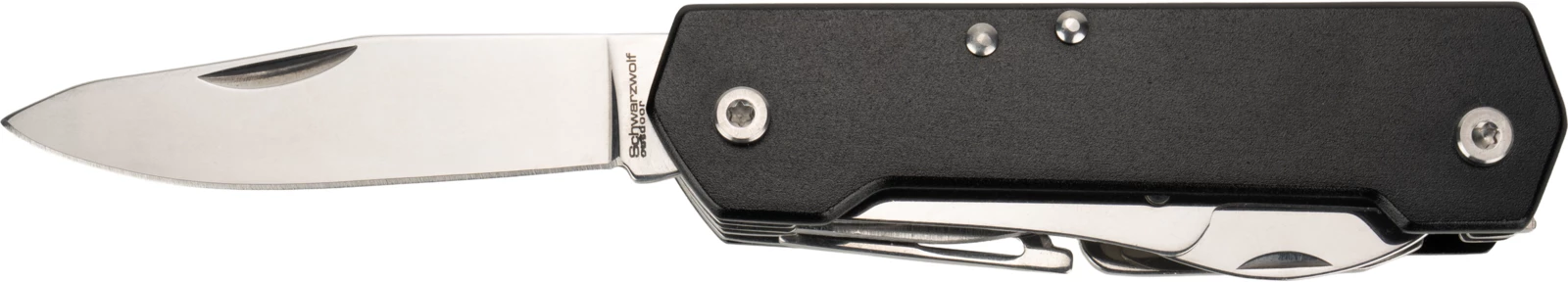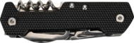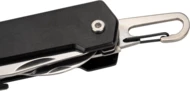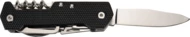 Wielofunkcyjny scyzoryk, posiadający 9 przydatnych narzędzi - nóż, nożyczki, piła, korkociąg, otwieracz do butelek, otwieracz do konserw, płaski śrubokręt, śrubokręt phillips i karabińczyk.
