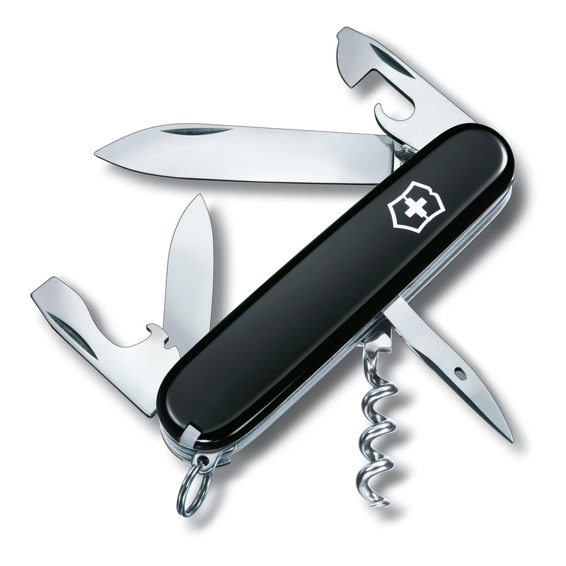 Funkcje: 1. duże ostrze 2. małe ostrze 3. korkociąg 4. otwieracz do puszek z 5. - małym śrubokrętem 3 mm (także do wkrętów gwiazdkowych) 6. otwieracz do kapsli z 7. - śrubokrętem 6mm 8. - ostrzem do zdejmowania izolacji 9. szpikulec - szydło 10. kółko 11. pęseta 12. wykałaczka Wymiary: 91 x 26.5 x 15 mm Oprawa: celidor