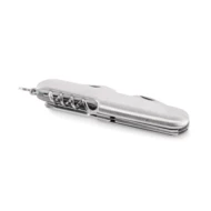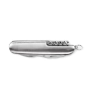 Wielofunkcyjny scyzoryk z aluminium pochodzącego z recyklingu. 5 funkcji: duże ostrze, otwieracz do butelek, śrubokręt, korkociąg i otwieracz do puszek.