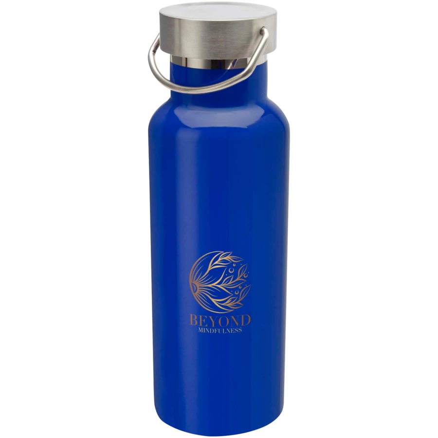 Wytrzymała butelka na wodę ze stali nierdzewnej z certyfikatem RCS i podwójnymi ściankami z izolacją próżniową, z zakręcaną pokrywką ze stali nierdzewnej i trwałym uchwytem ze stali nierdzewnej. Pojemność: 500 ml. Szczelne. Zapakowane w pudełko podarunkowe.