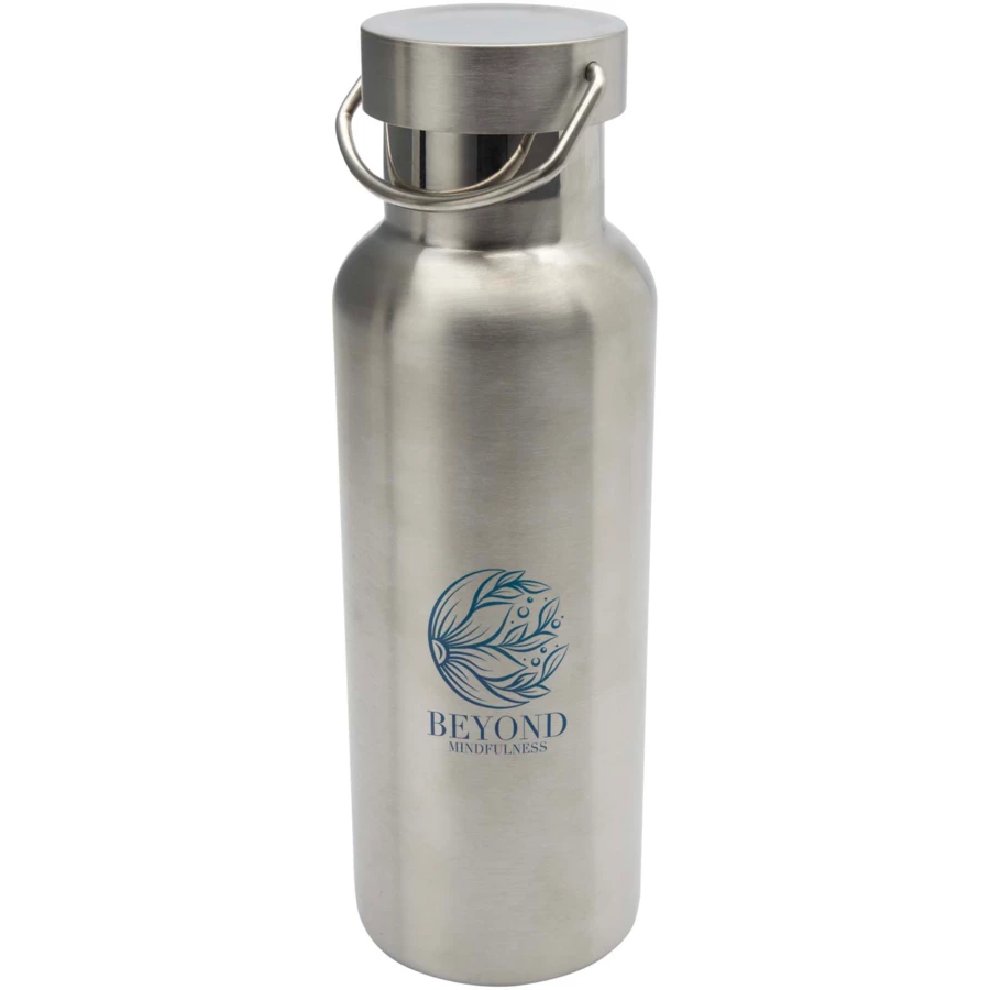 Wytrzymała butelka na wodę ze stali nierdzewnej z certyfikatem RCS i podwójnymi ściankami z izolacją próżniową, z zakręcaną pokrywką ze stali nierdzewnej i trwałym uchwytem ze stali nierdzewnej. Pojemność: 500 ml. Szczelne. Zapakowane w pudełko podarunkowe.