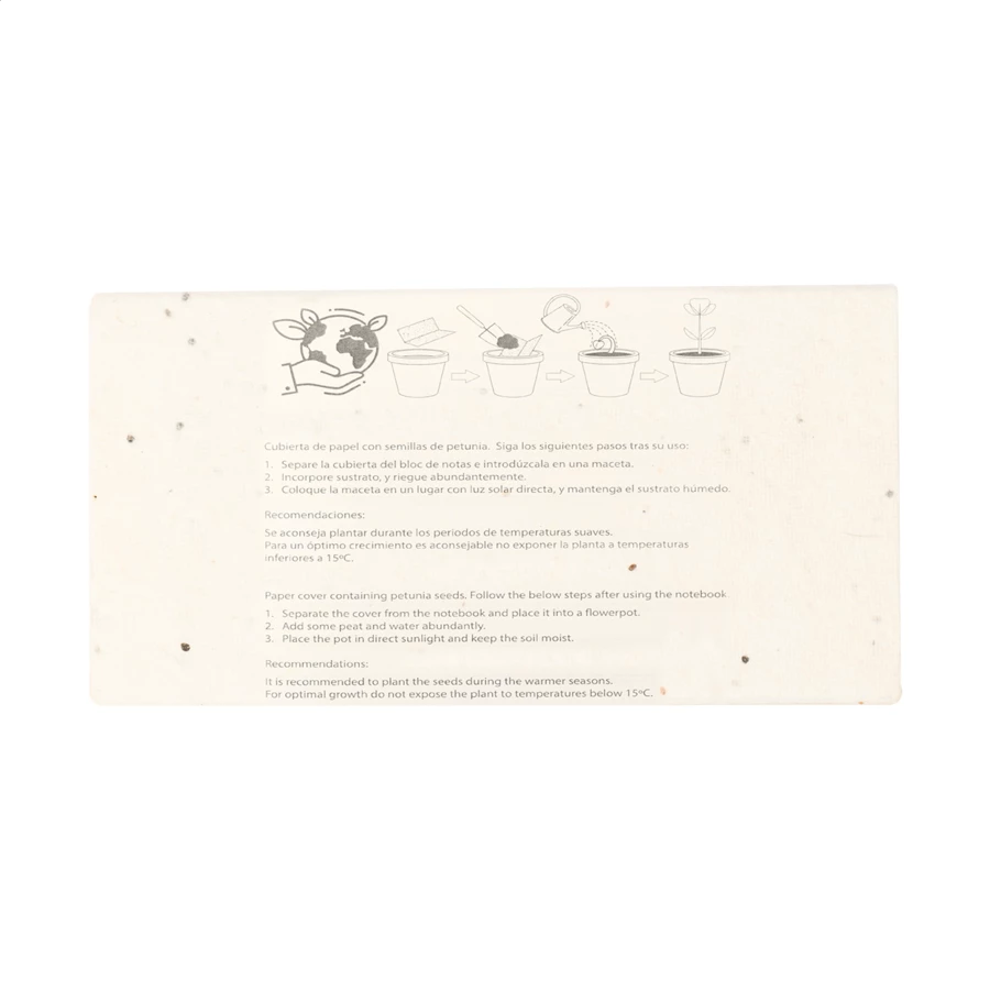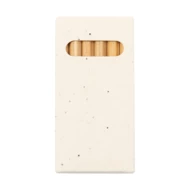 Zestaw 6 drewnianych kredek w pudełku z papieru nasiennego. Pudełko z papieru nasiennego zawiera nasiona petunii w różnych kolorach, które można zasadzić po użyciu.