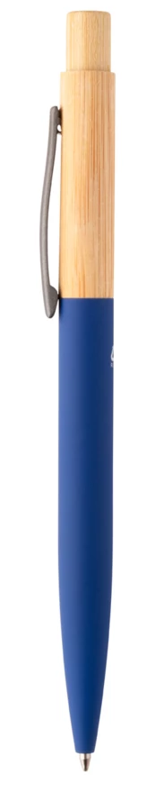 Długopis z bambusa i aluminium pochodzącego z recyklingu, z gumowanym wykończeniem i metalowym klipem. Z niebieskim wkładem.