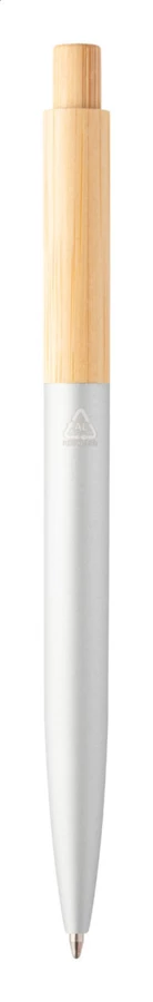 Długopis z bambusa i aluminium pochodzącego z recyklingu, z gumowanym wykończeniem i metalowym klipem. Z niebieskim wkładem.