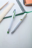 Plastikowy długopis z białym korpusem i srebrną koncówką. Z niebieskim wkładem.